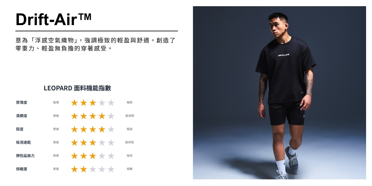 意為「浮感空氣織物」,強調極致的輕盈與舒適。創造了零重力、輕盈無負擔的穿著感受。