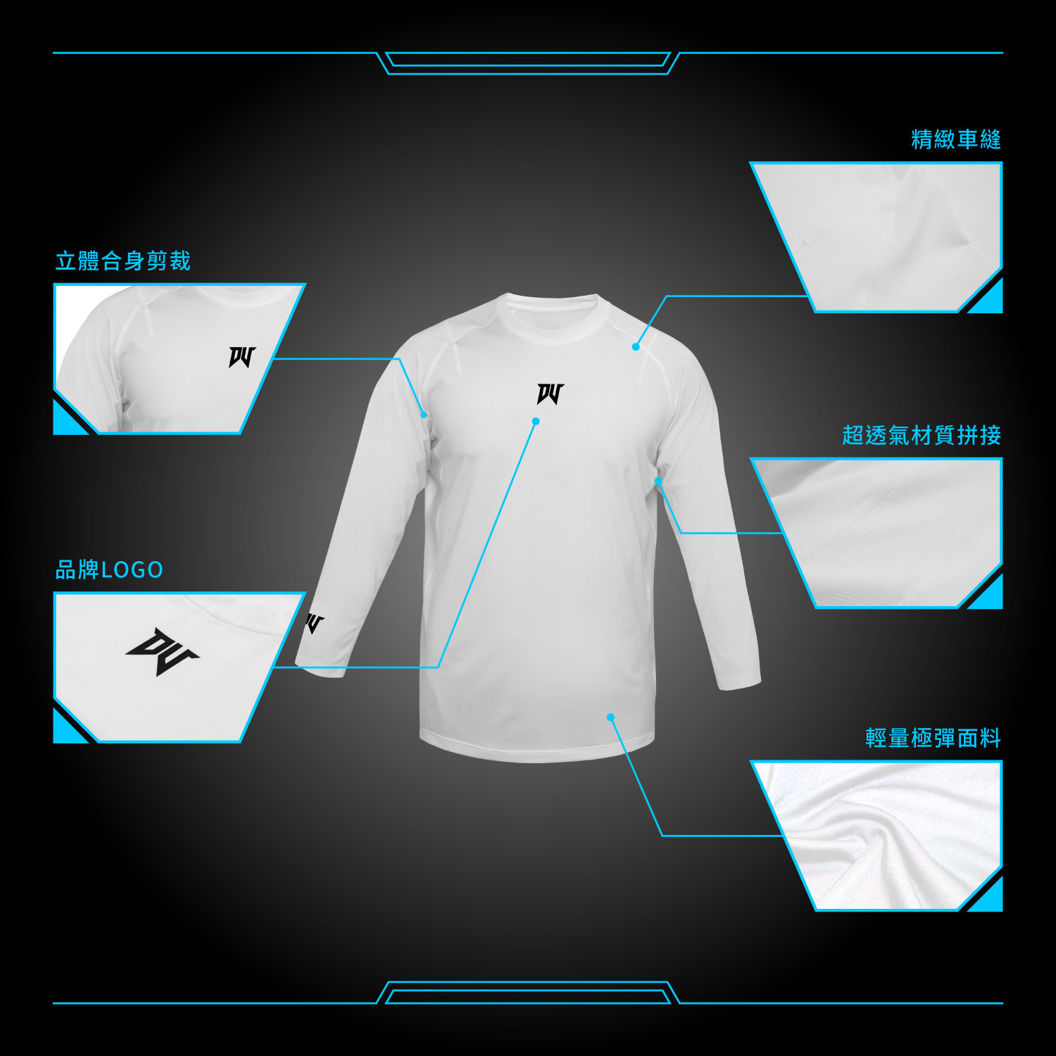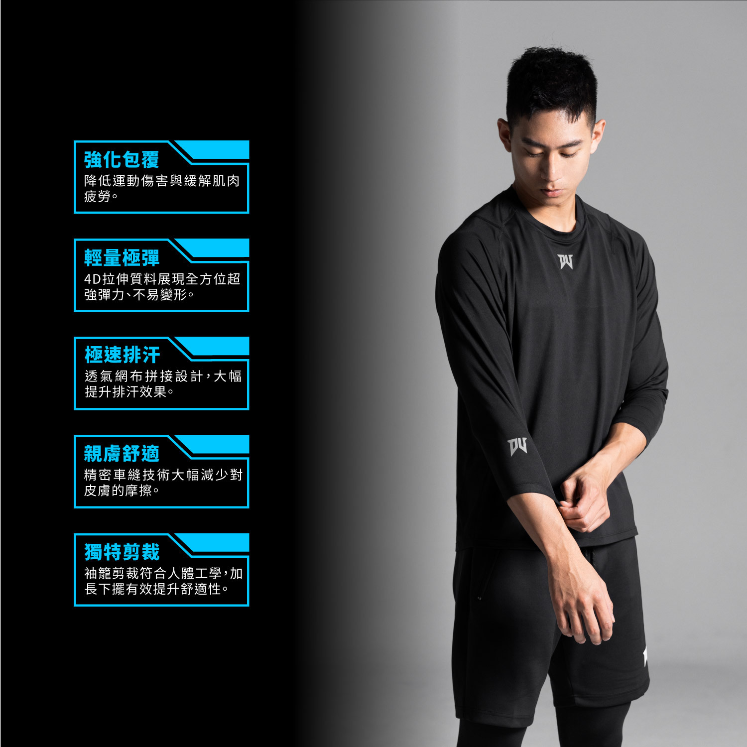 DV了解每位運動員在訓練時的情況,在大量流汗的同時,需要的除了極速排汗之外,更重要的是選用輕薄親膚面料,減輕訓練時身體的負擔穿著運動上更舒適,之外4D的拉伸質料在面對迅速膨脹的肌肉,不僅更能展現超強彈性面料,更能徹底包覆身軀,讓你體驗前所未有的極包覆與極舒適。